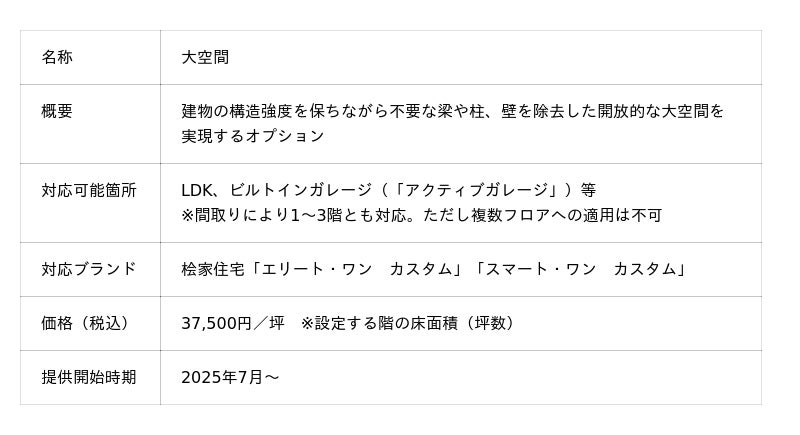 なお、「大空間」の販売にあわせ、高さ240cmの大開口サッシや、「アクティブガレージ」専用のスタイリッシュなシャッターなども新たに用意。このほかにも、開放感あふれる広々とした空間に適したオプションのラインアップを予定しています。