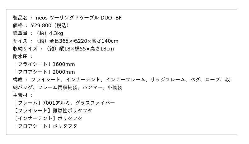 【 neos ツーリングドゥーブル DUO -BF 】https://www.logos.ne.jp/products/info/11503