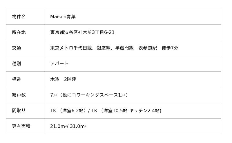 株式会社オーバーブースト(本社:東京都中央区、代表:佐藤 厚一郎)は、東京都渋谷区神宮前においてリノベーション工事を進めていたコワーキングスペース付きアパート「Maison青葉」が完成したことをお知らせいたします。