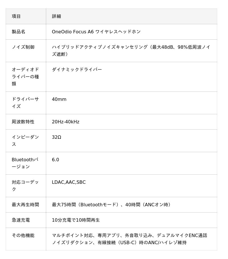 OneOdioは音楽を愛する全ての人々に向けて、高音質なヘッドフォンとイヤホンを提供し続けているグローバルなオーディオブランドです。この度、OneOdioはハイブリッドノイズキャンセリングワイヤレスヘッドホン「OneOdio Focus A6」を発売することをお知らせいたします。本製品は、これまでのOneOdioの技術と経験を結集し、比類ない音質、業界最高クラスのノイズキャンセリング性能、そして長時間のバッテリー駆動を実現。あらゆるシーンで最高のリスニング体験を提供する、次世代のヘッドホンです。