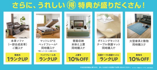 そのほか、ご購入の大型家具に合わせて、敷物や壁面収納の上置きが同時購入で10%OFFになる特典やソファの張地ランクUPなど、お得な特典を多数ご用意しております。