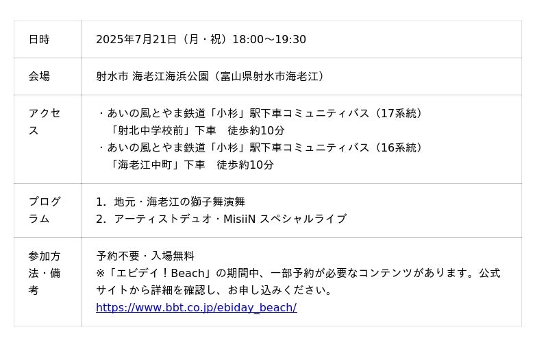 公式サイト:https://www.bbt.co.jp/ebiday_beach/