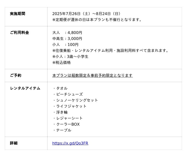 株式会社千鳥観光汽船(本社:静岡県沼津市/代表取締役:後藤武彦)は、2025年7月26日(土)~8月24日(日)の期間限定で、沼津港から大瀬崎へ向かう『船でGO!手ぶらde大瀬海水浴プラン』を実施いたします。