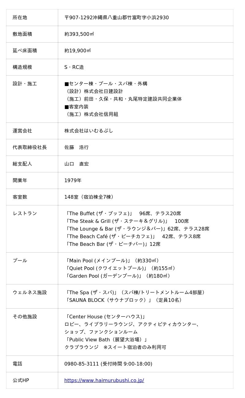 八重山諸島のほぼ中央に位置し、世界自然遺産の西表島を望む小浜島に、1979年日本初の本格的オーシャンリゾート「はいむるぶし」が誕生しました。石垣空港から高速船などを乗り継ぎ、約1時間半でアクセスできる立地も魅力です。「はいむるぶし」が目指すのは、「何をしても、何もしなくても幸せ」をコンセプトに、非日常のその先に安らぎという日常が息づく、幸せに満ち溢れたリゾートです。私たちは、卓越した品質と革新性で高いホスピタリティを実現し、小浜島から世界を魅了していきたいと考えております。八重山・小浜島の豊かな自然、脈々と受け継がれる文化、そして温かい人々こそが、大きな魅力であり、かけがえのない財産です。