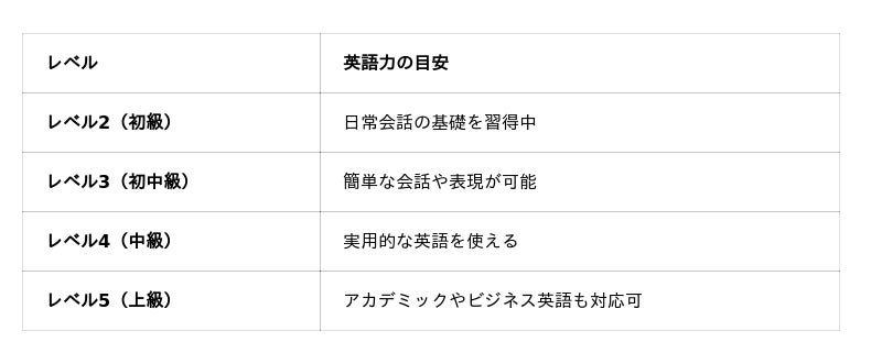 本コースは、受講者の英語力に応じて 4つのレベル(レベル2~5) を設けています。お申し込み後に受験いただくオンラインのクラス分けテストをもとに、最適なレベルからスタートできます。