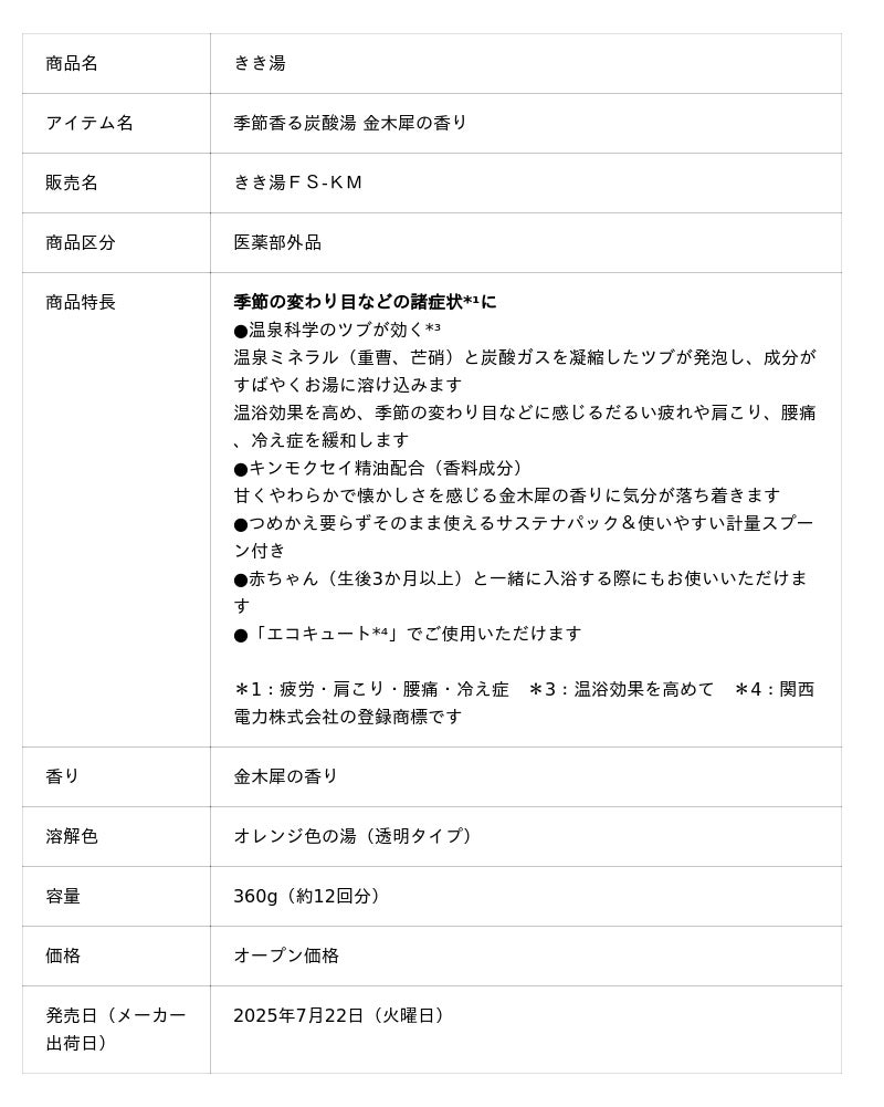 株式会社バスクリン(本社:東京都千代田区 社長:三枚堂正悟)は、炭酸入浴剤「きき湯」シリーズより、季節の変わり目などのゆらぎ*¹に寄り添う企画品「きき湯 季節香る炭酸湯 金木犀の香り」を7月22日(火曜日)に数量限定で発売いたします。温浴効果を高めて血行促進し、季節の変わり目に感じやすい疲労感や肩こり、腰痛、冷えなどを和らげます。ふんわりと甘く懐かしい金木犀の香りが広がり、気分もほぐれる心地よいバスタイムを演出します。