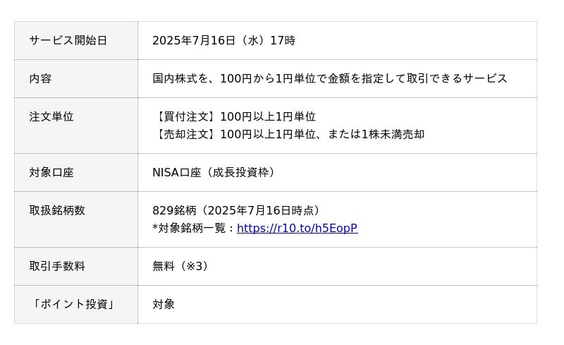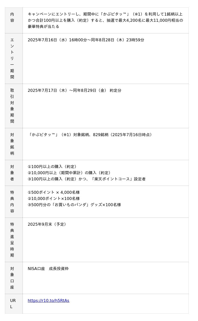 楽天証券は、「かぶピタッ(TM)」(※1)取引開始を記念して、2025年7月16日(水)より、「『かぶピタッ(TM)』(※1)リリース記念!100ポイントで株デビューキャンペーン」を開始しました。本キャンペーンは、楽天証券でNISA口座を保有するお客様が参加可能で、「かぶピタッ(TM)」(※1)で100円以上の株式を購入(約定)すると、抽選で最大4,200名のお客様に最大11,000円相当の特典が当たります。キャンペーン詳細は、楽天証券ウェブサイトをご覧ください。