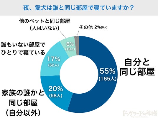 夜、愛犬がどのような環境で眠っているかを調査したところ、「飼い主と同じ部屋で寝ている」と答えた人が最も多く、全体の55%という結果に。