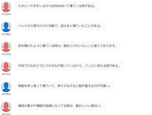 へそ天や白目、半目で眠るなど、思わず笑ってしまうような“寝姿”も多数報告されました。ちょっとクセのある寝顔も愛おしいですよね!