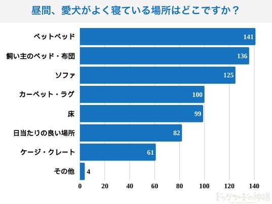 愛犬が昼間に最もよく寝ている場所は「ペットベッド」(141票)でした。安心できる“自分専用の空間”として、多くのワンちゃんのお気に入りスポットになっているようです。
