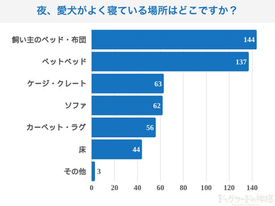 飼い主さん300名に聞いた結果、夜は約8割の愛犬が“誰かと一緒に寝ている”ことが判明。人気な寝場所は「ペットベッド(昼間)」と「飼い主のベッド・布団(夜)」という結果に。個性あふれる寝姿エピソードも!