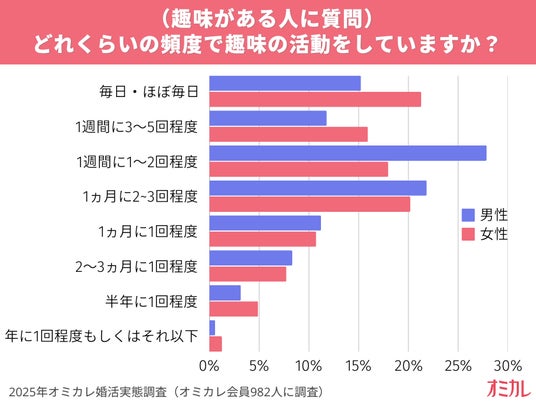 一方、男性は「1週間に1~2回程度」が約28%と最も多く、女性より頻度はやや落ち着くものの、定期的に趣味の時間を確保する層が多いことが分かります。