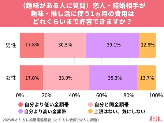 趣味に使うお金は男性の方が高額の傾向に。恋人・結婚相手の趣味・推し活費用は「自分と同額程度」なら許容範囲