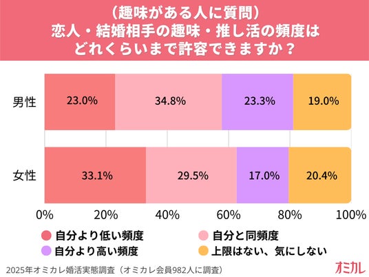 費用に関しては「自分と同じか、または自分より高い金額帯」を許容する人が多数派でしたが、趣味・推し活の頻度となると一転…「自分より低い頻度」でしか許容できないと回答した人が、男性で約23%%・女性で約33%という結果になりました。