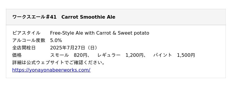 「WORKS Ale」は、よなよなビアワークスが毎回異なるスタイルでお届けする、数量限定のオリジナルビールシリーズです。ビールの本場・アメリカのトレンドや、日本では珍しいスタイルにも挑戦しています。今回は第41弾として、「Carrot Smoothie Ale」が登場します。 醸造タンク1本分のみの超限定生産で、都内6店舗のよなよなビアワークスでのみ提供されます。