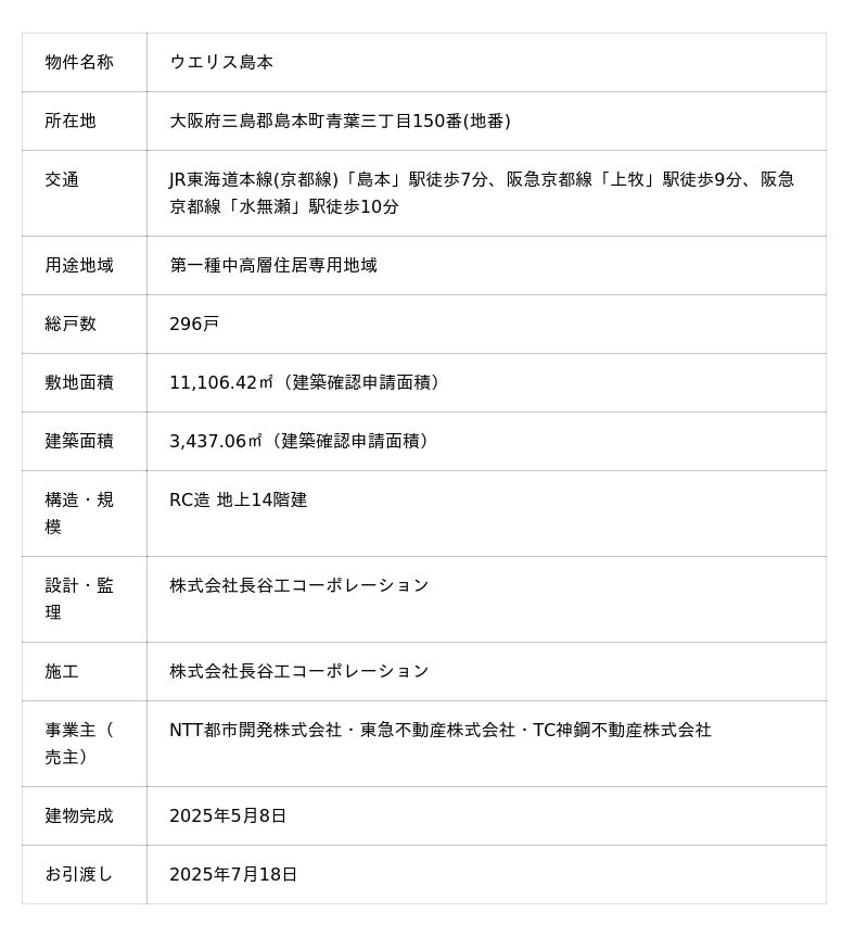 NTT都市開発株式会社(本社:東京都千代田区、代表取締役社長 池田 康)および、東急不動産株式会社(本社:東京都渋谷区、代表取締役社長 星野 浩明)、TC神鋼不動産株式会社(本社:兵庫県神戸市、代表取締役 藤野 悦郎)は、このたびJR京都線沿線最大級※1のレジデンスとなる「ウエリス島本」が竣工したことをお知らせします。
