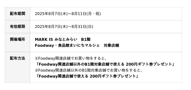 MARK IS みなとみらい B1階「食品館 まいにちマルシェ」のリニューアルオープンから2周年を記念して、8月7日(木)~8月11日(月・祝)の5日間限定で、対象店舗でお買い物いただいた方に200円分のギフト券を配布いたします。