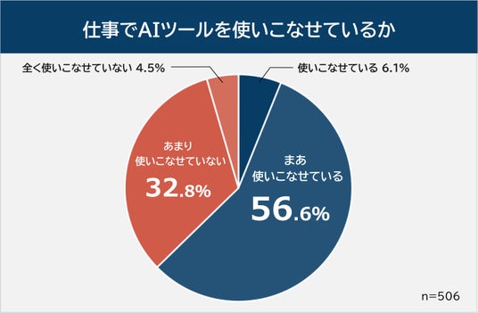 「仕事でAIツールを使いこなせているか」という問いには、「使いこなせている(6.1%)」「まあ使いこなせている(56.6%)」と回答した人が合わせて62.7%という結果に。AIツールの使いこなし方については、「一定の手応え」を感じている人が多数派です。
