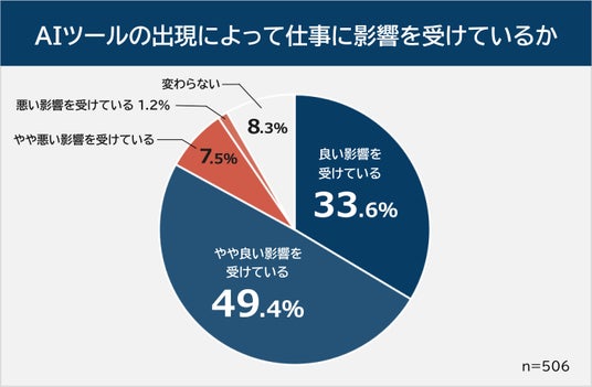 仕事でAIツールを使っている506人に「AIツールの出現によって仕事に影響を受けているか」を聞いたところ、影響を受けている人は、91.7%。そのうち良い影響を受けている人は83.0%で、悪い影響を受けていると感じている人は8.7%でした。