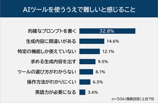 「AIツールを使ううえで難しいと感じること」の圧倒的1位は「的確なプロンプトを書く(32.8%)」。2位「生成内容に間違いがある(14.6%)」、3位「特定の機能しか使えていない(12.1%)」が続きます。