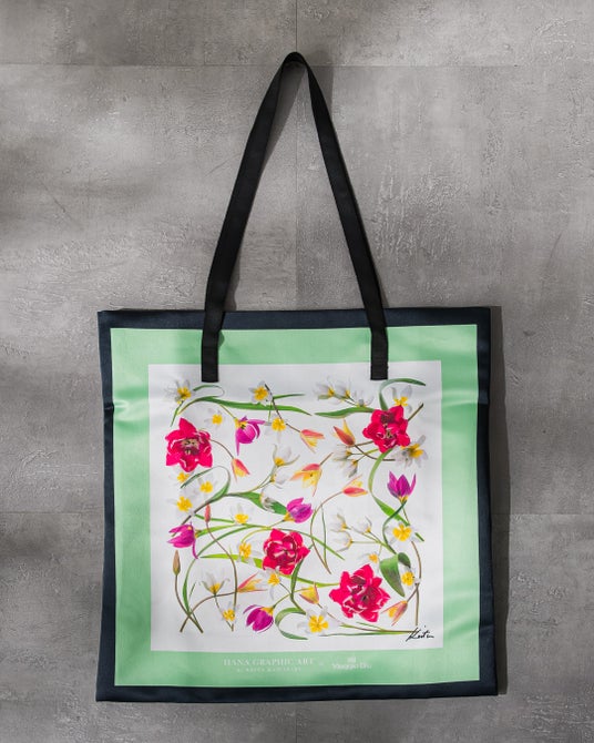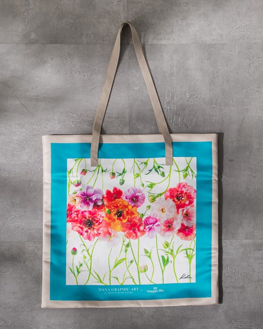 今回ビアッジョブルーがコラボさせて頂いたアイテムは、「トートバッグ」。川崎氏が2006年から2013年まで主宰を務めた、フラワーデザインの先駆けであるマミフラワーデザインスクールは、台湾にも多くの教室を持ち、現在も多数のお弟子さんや生徒さんが在籍しています。ビアッジョブルーでは、そんな花をこよなく愛する台湾の女性に向けて、HANA GRAPHIC ARTの美しい世界観を最大限に引き出した、華やかな「大人のお稽古バッグ」を作成しました。“花を纏う”ようなアートとファッションの融合が生み出す、唯一無二のプロダクトです。