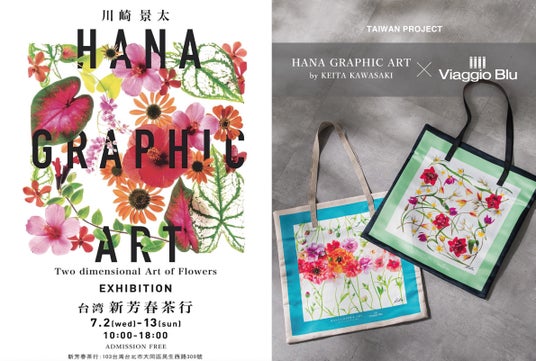 日本を代表するフラワーアーティスト川崎氏は、2025年7月2日から13日、台湾の歴史的文化建築「新芳春茶行」にて、台湾では初となる個展「HANA GRAPHIC ART -Two dimensional Art of Flowers-」を開催し、台湾の方々から大好評を得ました。今回ビアッジョブルーは、華やかな「大人のお稽古バッグ」をイメージしたトートバッグをコラボさせていただき、台湾で発売するという貴重な機会を頂きました。