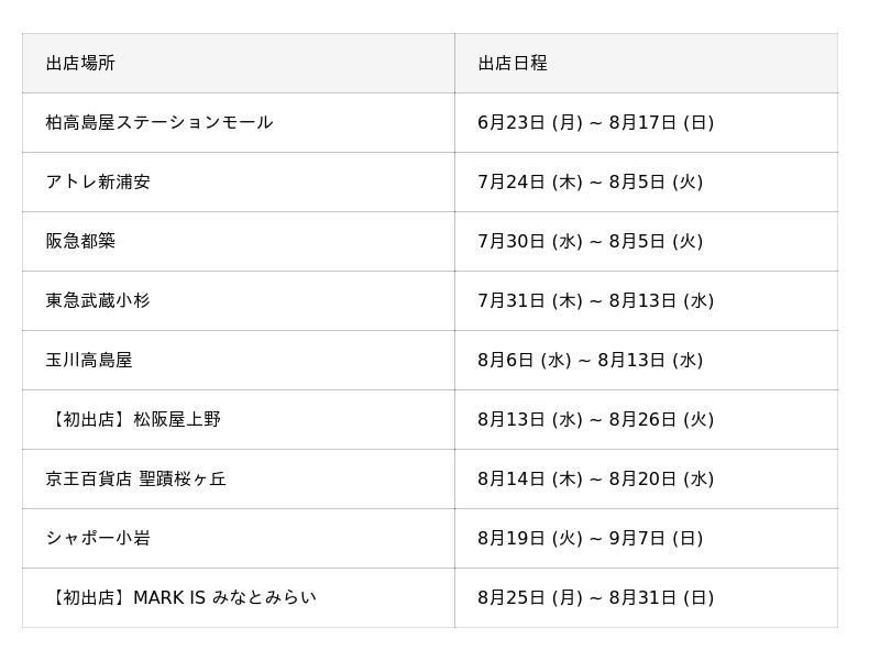 又、8月度の期間限定店舗として、今回初出店となるMARK IS みなとみらい(神奈川県横浜市)や、松阪屋上野店(東京都台東区)を含む東京、神奈川、千葉、埼玉の計9箇所の百貨店や駅ビル等、各施設の催事場や特設会場へ出店いたします。