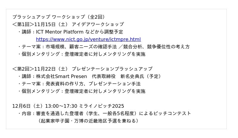 また、本イベントは、総務省および国立研究開発法人情報通信研究機構(NICT)共催の「起業家甲子園・起業家万博」近畿地区予選も兼ねており、優秀な成績を収めた参加者には全国大会への出場権(NICT賞)が与えられます。
