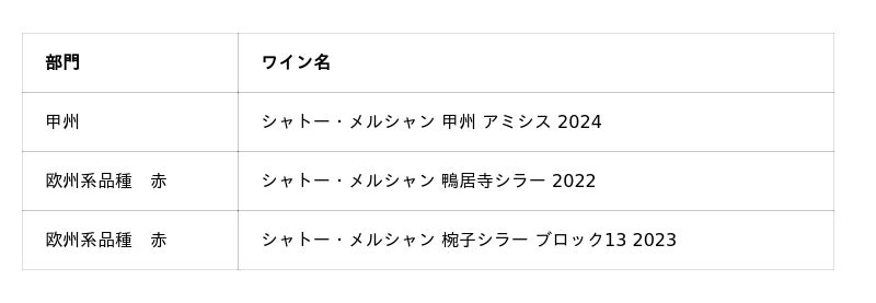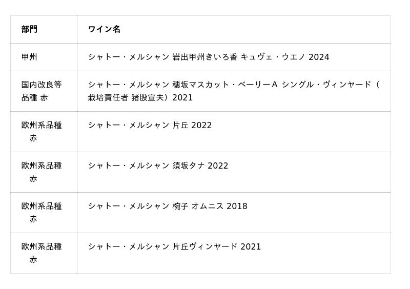 また、「シャトー・メルシャン 椀子オムニス 2019」など11品が銀賞を、「シャトー・メルシャン 岩出甲州きいろ香 キュヴェ・ウエノ 2024」など計6品が銅賞を受賞しました。
