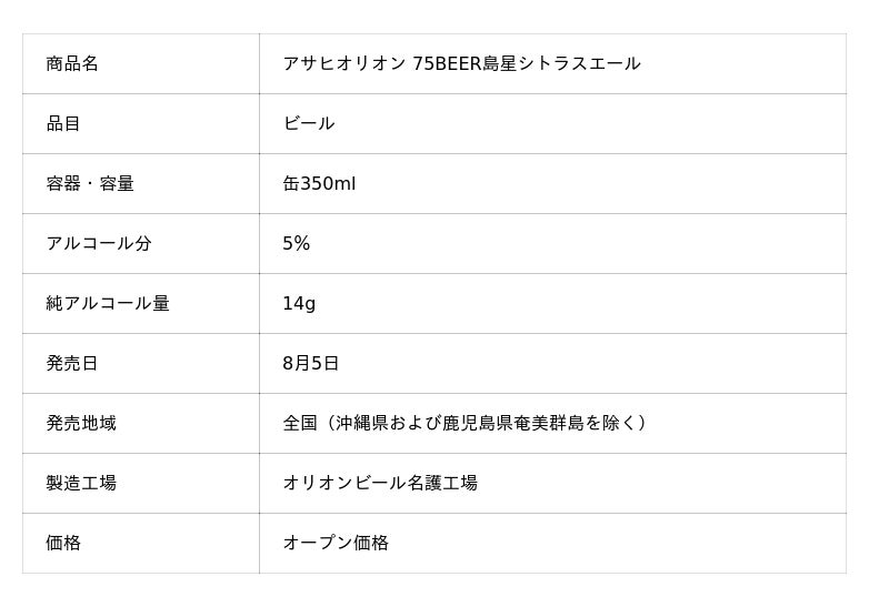 アサヒビール株式会社(本社 東京、社長 松山一雄)は、オリオンビール株式会社(本社 沖縄、社長 村野一)が製造するビール『アサヒオリオン 75BEER島星シトラスエール』を、8月5日から数量限定で発売します。