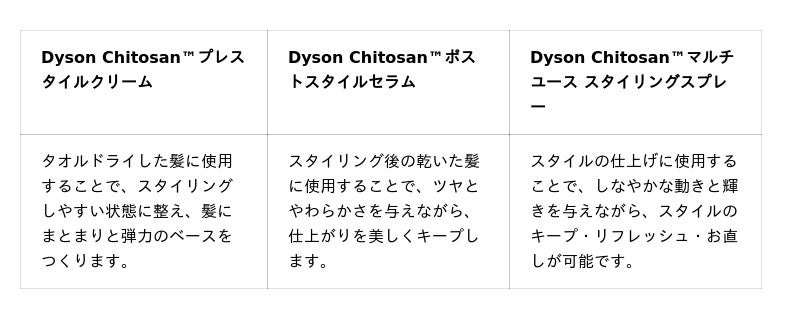 Dyson Chitosan(TM)スタイリング剤シリーズは、スタイルの土台を整える“下地”、フォルムを際立たせる“ディファイン”、そして仕上げの“ホールド”までをトータルにサポートします。