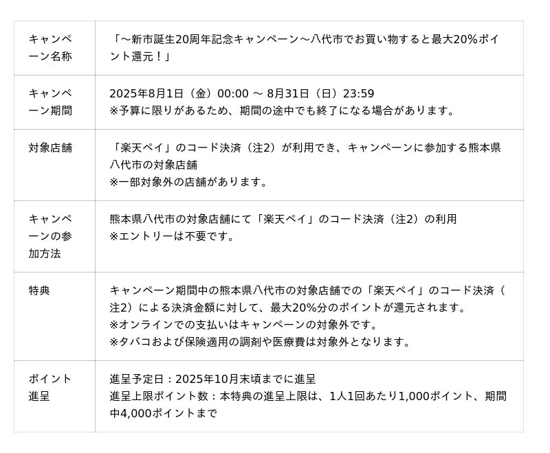 楽天ペイメント株式会社(以下「楽天ペイメント」)は、運営するキャッシュレス決済サービス「楽天ペイ」において、熊本県八代市が2025年8月1日(金)から8月31日(日)まで実施する「~新市誕生20周年記念キャンペーン~八代市でお買い物すると最大20%ポイント還元!」に参加することをお知らせします。