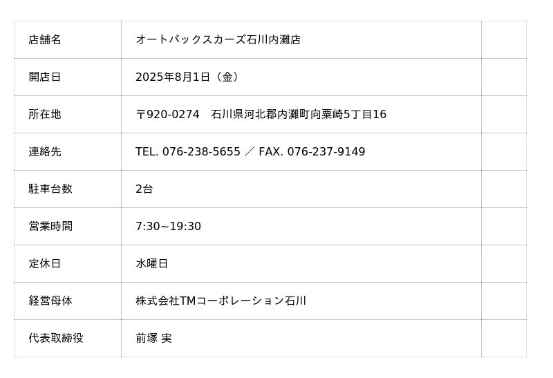 株式会社オートバックスセブン(代表取締役 社長:堀井勇吾)が展開する車買取・販売事業「AUTOBACS CARS(以下、オートバックスカーズ)」は、オートバックスカーズフランチャイズ契約を株式会社TMコーポレーション石川(代表取締役:前塚実)と締結し、2025年8月1日(金)に「オートバックスカーズ石川内灘店」をオープンいたします。