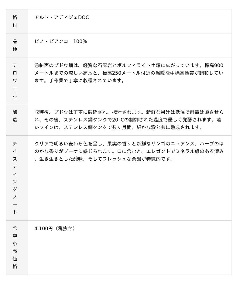 ■ Pinot Bianco(ピノ・ビアンコ)についてアルト・アディジェを代表する白ブドウ品種。フレッシュなリンゴなどのフルーティなアロマにハーバルなタッチをもつブーケ。エレ ガントで深みのあるミネラルといきいきとした酸の絶妙なバランスは山のワインならではの味わいです。