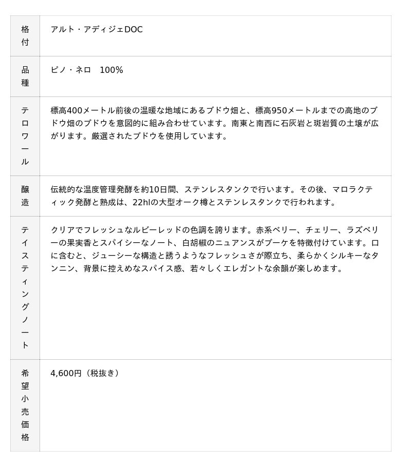 ■ Pinot Nero(ピノ・ネロ)について標高400mの暖かい場所と、600mに至るまでの高地で収穫されたブドウが使われています。ベリーやチェリーの果実味と白コショウなどのスバイシーな香りが特徴です。