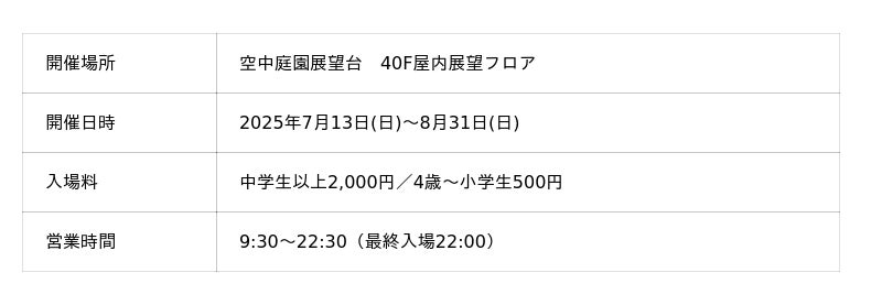 梅田スカイビル・空中庭園展望台では、2025年7月13日(日)~8月31日(日)期間中、40F屋内展望フロアにて深海をイメージした装飾「Floating Deep Blue」を開催しています。
