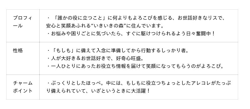 「リス」には、体の小ささや頬袋に「小さな備え」を、その俊敏性と活発さに「いきいき」としたイメージを重ね合わせています。