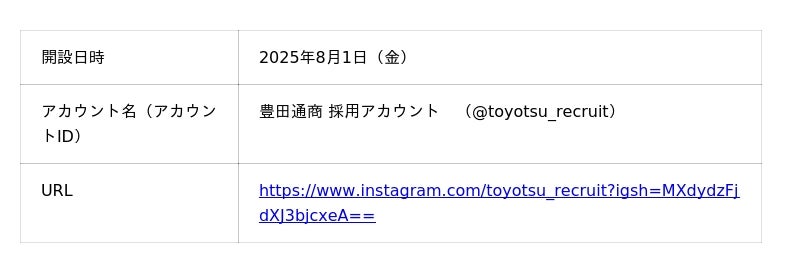 豊田通商株式会社(以下:豊田通商)は本日、豊田通商で働くことに興味・関心をもってくださる方々に向けて、豊田通商の魅力をより身近に知っていただくために、Instagramの採用アカウントを開設しました。