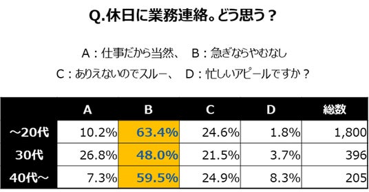 「休日に業務連絡、どう思う?」の設問では、Z世代でも63.4%が「急ぎならやむなし」(選択肢B)と回答。ワークライフバランスを重視し、休日対応に消極的なイメージとは異なり、“必要なら対応する”責任感ある姿勢が垣間見えました。
