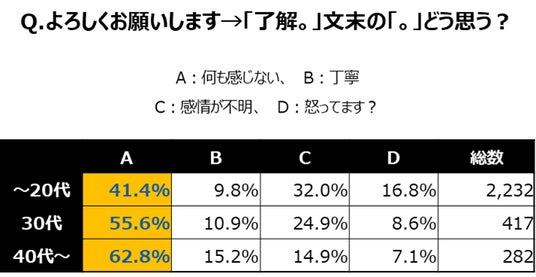 昨今、威圧的と受け取られる“マルハラ”が話題になる中、「よろしくお願いします→『了解。』の句点どう思う?」の設問では、各世代ともに「何も感じない」(選択肢A)という回答が最多で、Z世代では41.4%が選択。実際には“句点があっても気にしない”人が多数で、世代間で大きな溝はないことが浮き彫りになりました。