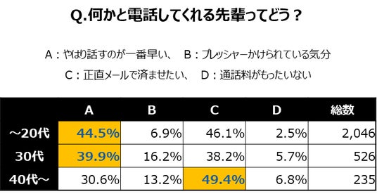 「何かと電話してくれる先輩ってどう?」という問いに対しても、Z世代の約半数(44.5%)が、「やはり話すのが一番早い」(選択肢A)と回答し、電話を嫌がるイメージとは裏腹に“電話肯定派”が多い結果になりました。一方、40代以上は「正直メールで済ませたい」(選択肢C)を選んだ割合が約半数(49.4%)に上り、むしろ上の世代のほうが“電話を避けたい”傾向にあることがわかりました。