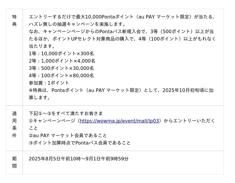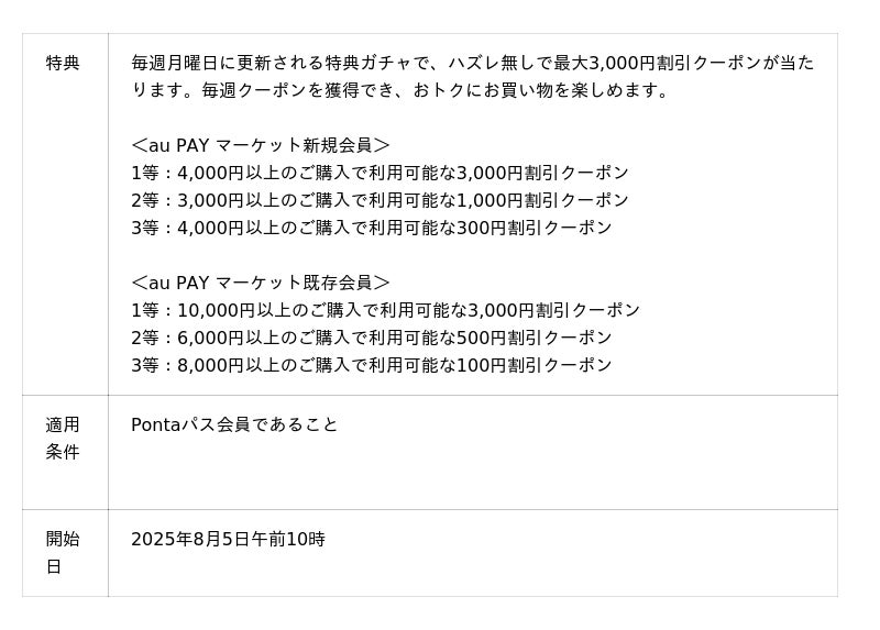 auコマース&ライフは、運営する総合ショッピングサイト「au PAY マーケット」において、毎週入れ替わる厳選目玉商品が最大50%ポイント還元される「Pontaパス ポイントUPセレクト」特典を、サブスクリプションサービス「Pontaパス」会員向けに、2025年8月5日から提供開始します。あわせて、最大3,000円割引クーポンが抽選で当たるガチャも毎週開催し、お客さまはよりおトクにお買い物をお楽しみいただけます。