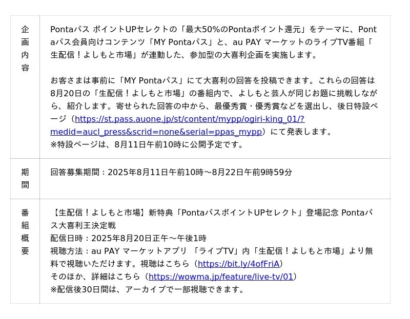 auコマース&ライフは、Pontaパスとの連携を通じて、Ponta経済圏のさらなる拡大を図るとともに、「暮らしが満たされるお買い物体験」の提供を追求していきます。