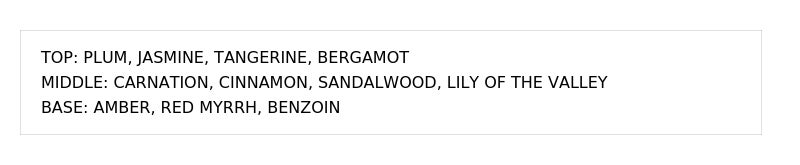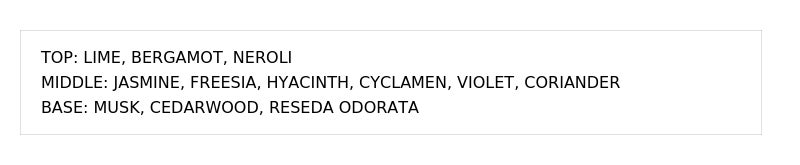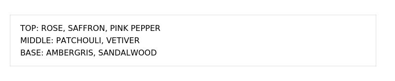 官能的なジャスミンと、深みあるパチョリのアーシーさが交わる大人のフローラルウッディー調。上品で柔らかな甘さ+ミステリアスな魅力が感じられます。特別なシーンや少し落ち着いた夜の時間にも似合う香りです。