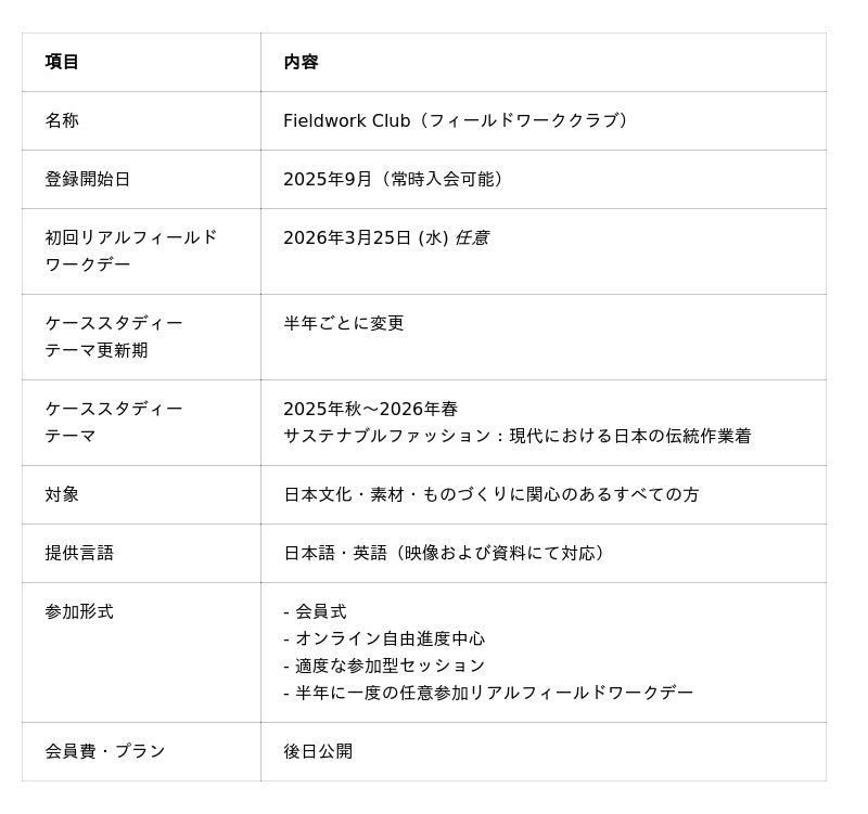 特に注目すべきは、最終目的:Fieldwork Clubメンバーが京都研究所と伝統職人と共同開発するオリジナルワークウェアです。学びや交流を重ねて、実際日々纏いたいと思える衣類を形にして、使用する素材や技術の現代における実用的価値を証明する。