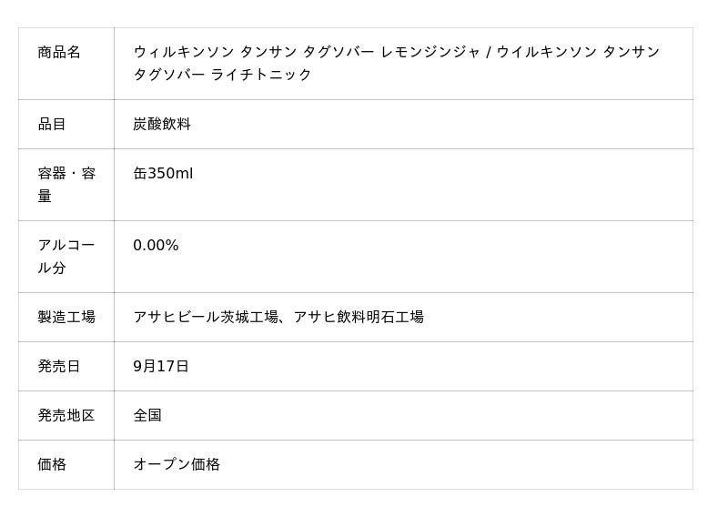 アサヒビール株式会社(本社 東京、社長 松山一雄)は、ノンアルコールカクテルテイスト飲料※1「ウィルキンソン タンサン タグソバー」を9月17日から発売します。