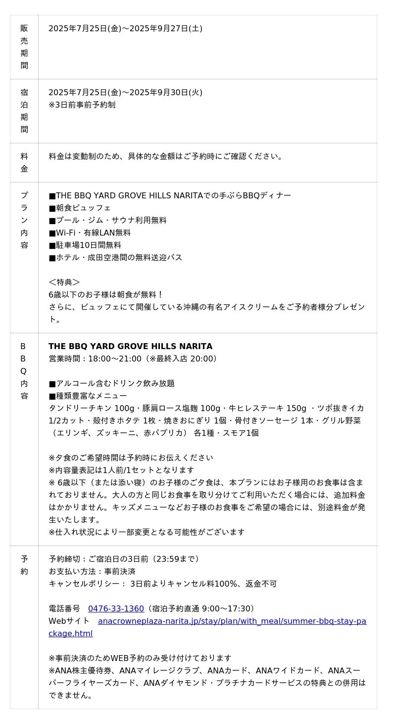 ANAクラウンプラザホテル成田(成田市堀之内 総支配人 ダヴィデ・ザナルディ)では、7月25日(金)から屋外BBQ会場「THE BBQ YARD GROVE HILLS NARITA」でのBBQディナーが付いた『夏は成田で手ぶらラクラクBBQ!家族や仲間と楽しむ宿泊プラン』の販売を開始いたしました。