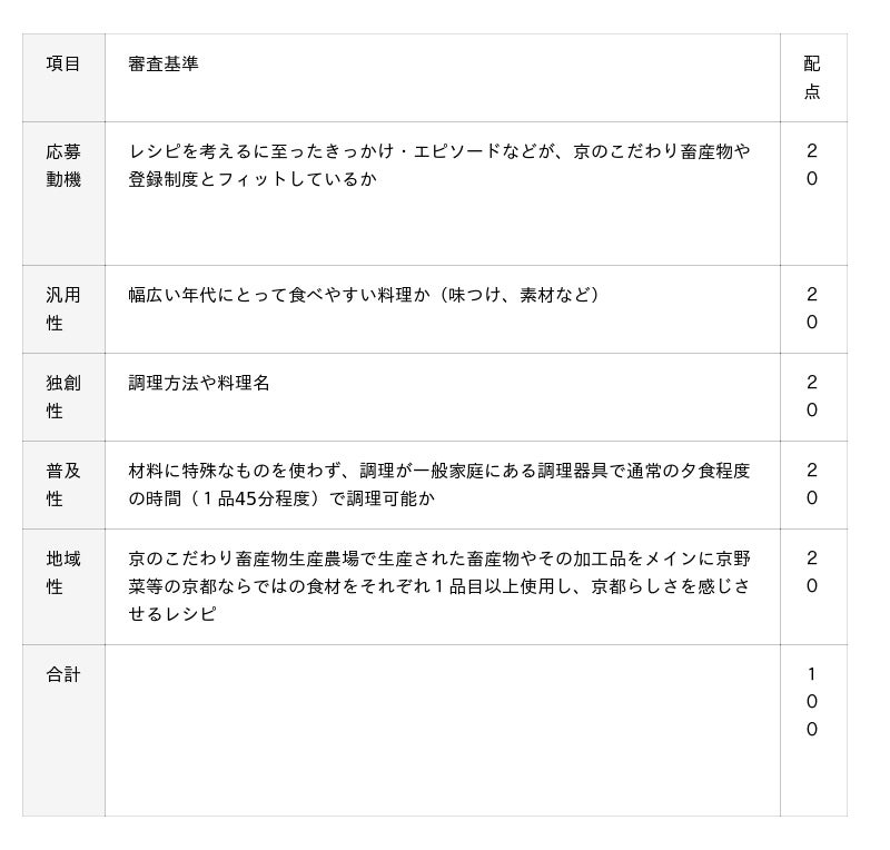 ・「京のこだわり畜産物生産農場」で生産された畜産物やその加工品をメインに据え、京野菜等の京都ならではの食材を1品目以上使用した、京都らしさを感じさせるレシピ