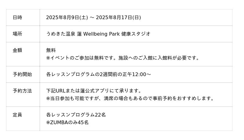 「うめきた温泉 蓮 Wellbeing Park」(総支配人:藤立 達哉、所在地:大阪市北区)は、2025年8月9日から8月17日まで、「REN FITNESS 2025 SUMMER」と題し、特別レッスンイベントを開催いたします。