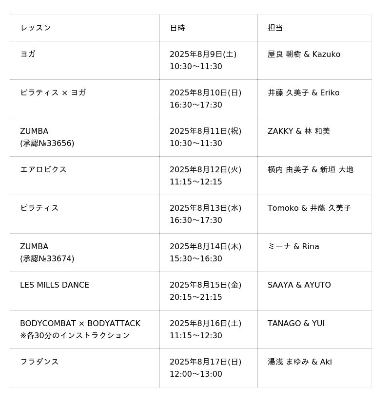 同イベントでは、ZUMBA、ヨガ、レズミルズ、フラダンス等、幅広いジャンルのフィットネスレッスンを日替わりで実施。いずれのレッスンプログラムも同施設で活躍する人気インストラクターのコラボレーションとなっており、初めての方でも安心してご参加いただける内容です。気軽に楽しみながら身体を動かし、心身のリフレッシュを目指します。